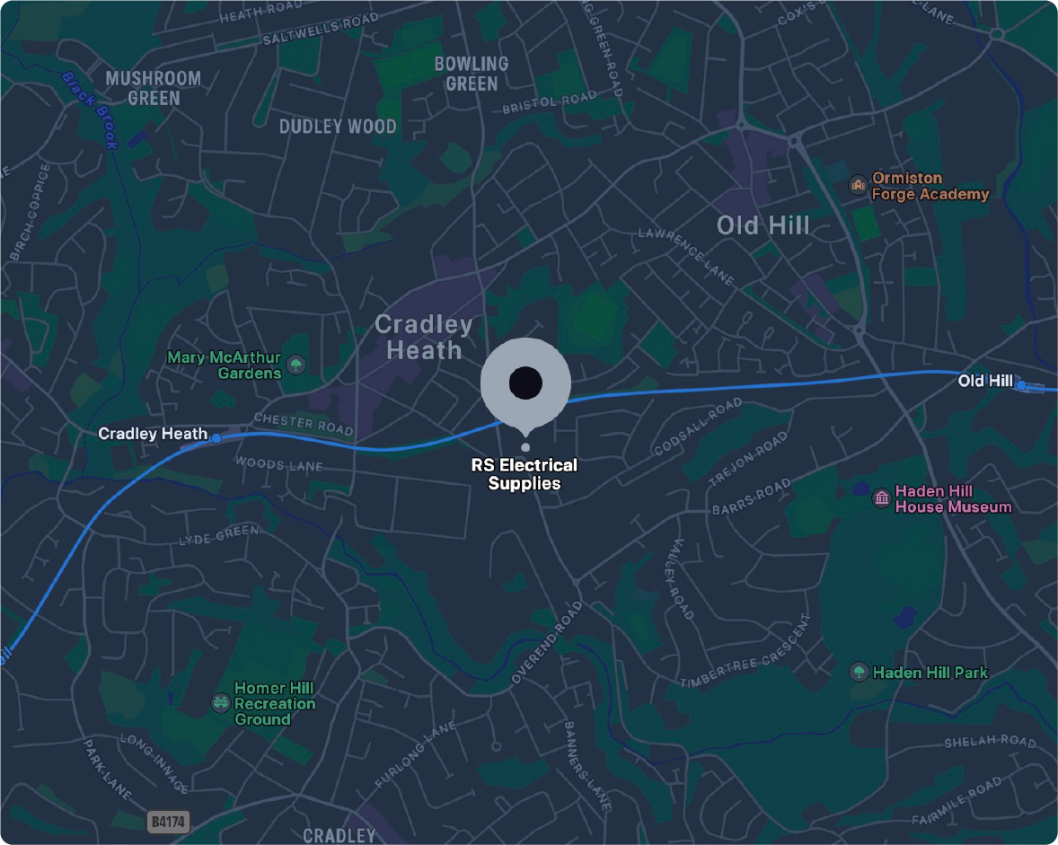 RS Electrical Supplies is based in the West Midlands and welcomes both trade and the general public. If you're local to Cradley Heath, come and visit us!