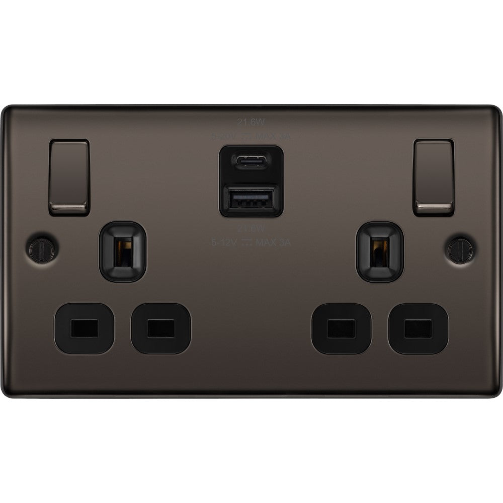 View full detailsThe DPBN586BK is a 13A double A+C USB socket from the Click Deco Plus range by Scolmore, finished in black nickel. Expertly crafted from durable st...