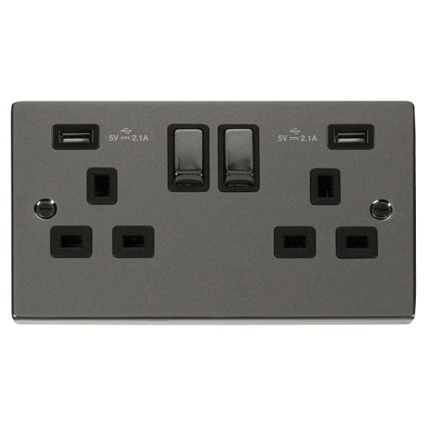 View full detailsThe VPBN580BK is a 13A double USB socket from the Click Deco range by Scolmore, finished in black nickel. The Click Deco range has a distinctive ra...
