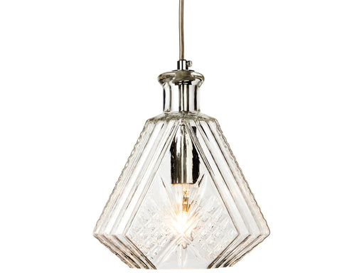 Uniquely designed around a drinks decanter this clear cut glass style pendant has chrome metalwork and clear cable.