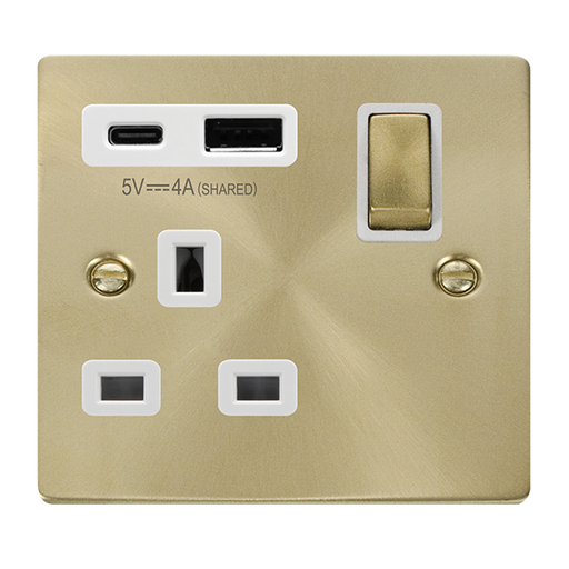 View full detailsThe VPSB586WH is a 13A Double A+C USB Socket from the Click Deco range by Scolmore, finished in satin brass with a white insert. The Click Deco ran...