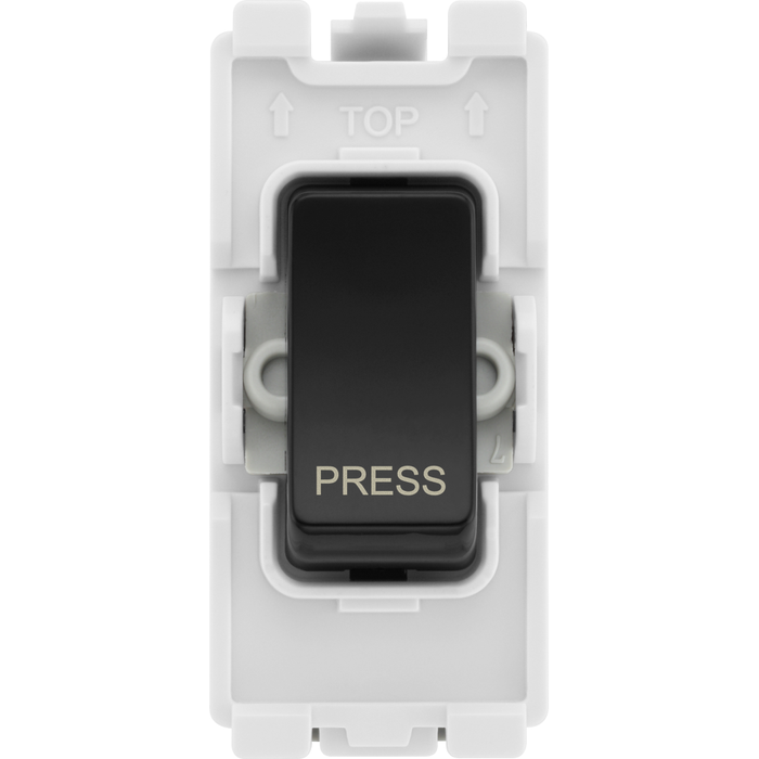 The BG Electrical RPCDB14 is a 20 Amp, retractive grid module with a black rocker marked 'Press'. Compatible with the BG Evolve grid range, grid modules enable you to customise your own switch, by combining three elements, grid plate, grid frame and grid module.