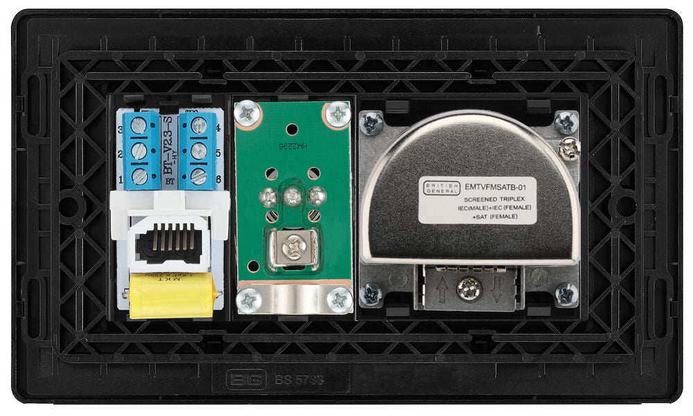 The PCDMBTRI2B is a TV/FM/SAT combination socket from the BG Evolve range, finished in matt black and built using the BG Euro Modular system. The BG Evolve range is new on the outside with its polycarbonate front plates and contrasting frame, but has the same internal technology as the BG Nexus Metal range. With interchangeable front plates, the Evolve range allows you to move with the trends without losing the level of quality and reliability.