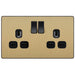 The PCDSB22B is a 13A double socket from the BG Evolve range, finished in satin brass. The BG Evolve range is new on the outside with a polycarbonate front plate and contrast frame, but the inside is the same trusted technology as the BG Nexus Metal range. The satin brass finish comes with contrast black frame and black inserts.
