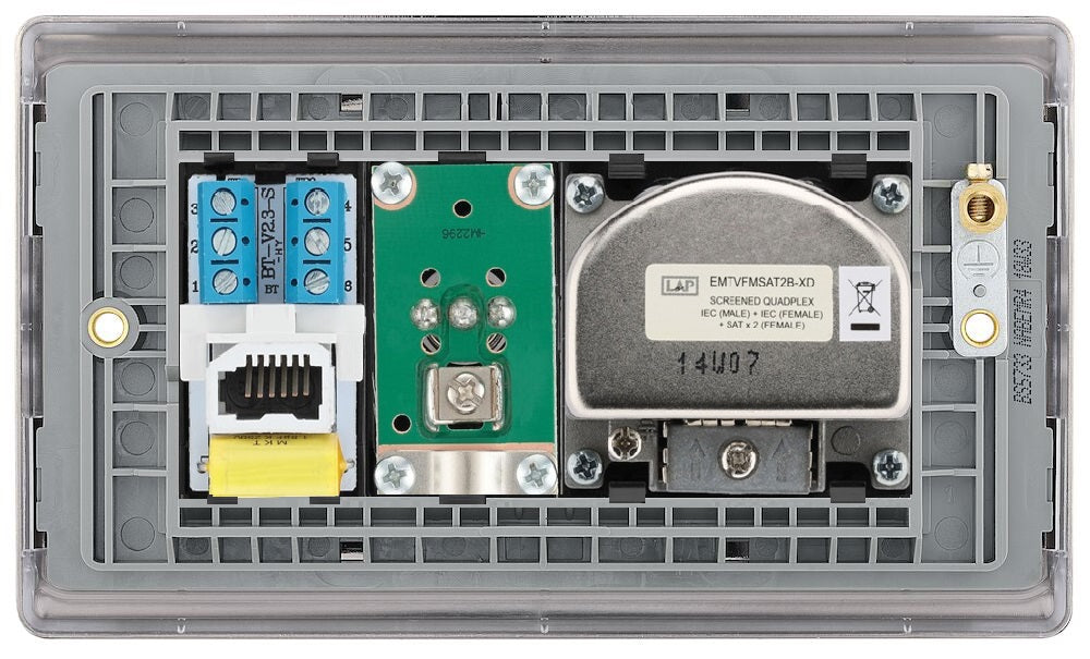 The NAB69B is a combination TV socket from the BG Nexus Metal range, finished in antique brass with black inserts and built using BG Euro Modular system. This range of switches and sockets has been designed with a modern, slim profile and has a lightly lacquered surface to reduce fingerprint marks.