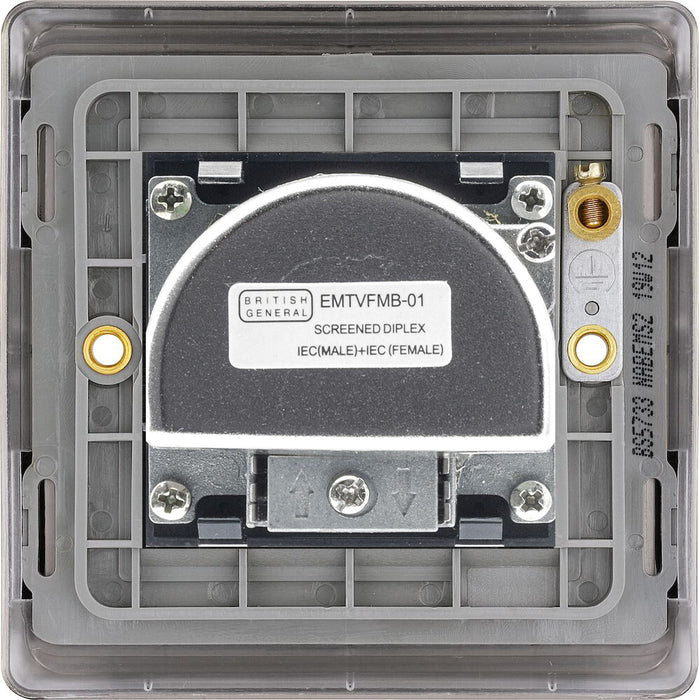 The NAB66B is a TV & FM socket from the BG Nexus Metal range, finished in antique brass with black inserts and built using BG Euro Modular system. This range of switches and sockets has been designed with a modern, slim profile and has a lightly lacquered surface to reduce fingerprint marks.