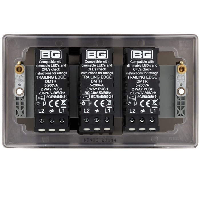 The NBN83 is a 3G dimmer switch from the BG Nexus Metal range, finished in black nickel. This range of switches and sockets has been designed with a modern, slim profile and has a lightly lacquered surface to reduce fingerprint marks.
