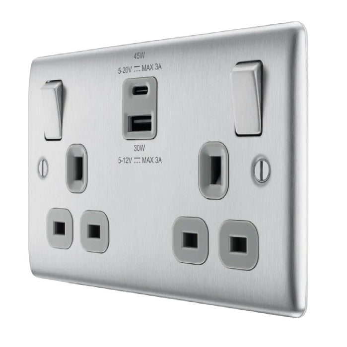 BG Nexus Metal Brushed Steel 13A Double USB Socket with 45W A+C Ports NBS22UAC45G